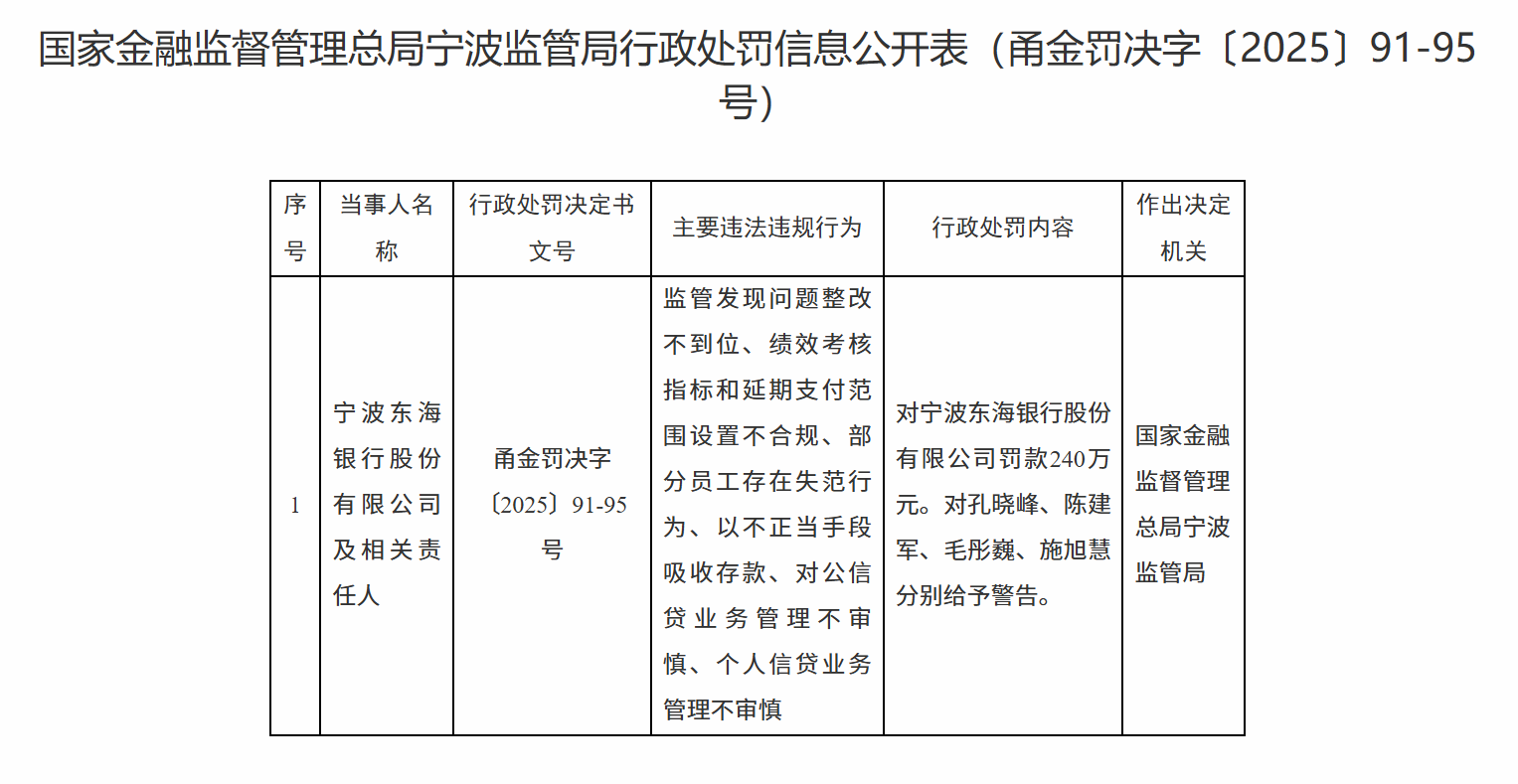10月17日,国家金融监督管理总局宁波监管局行政处罚信息公示表显示,宁波东海银行股份有限公司及相关责任人因对管理层发现的问题整改不力、不符合与人结婚部分指标绩效指标设定不符、不同意部分指标的规定,被罚款240万元。 部分从业人员指标中,吸收存款方式不当、企业信贷业务管理不当、个人信贷业务管理不善等。孔某峰、陈某军、毛某伟、石某辉分别受到警告处分。